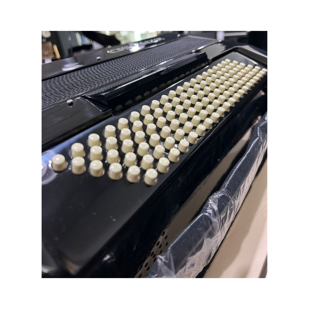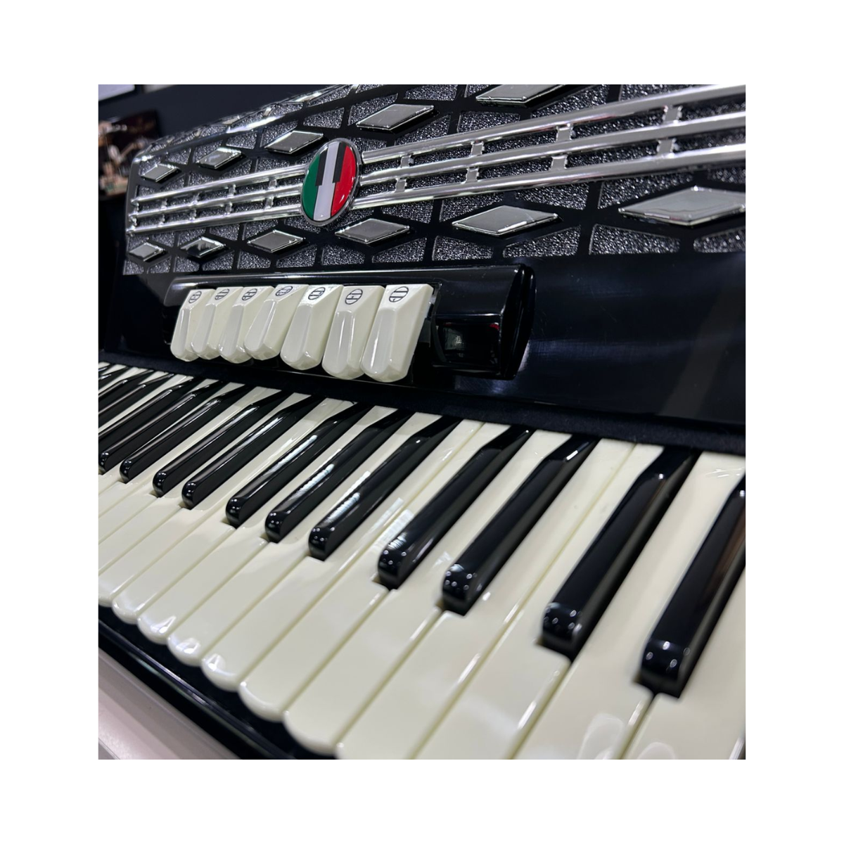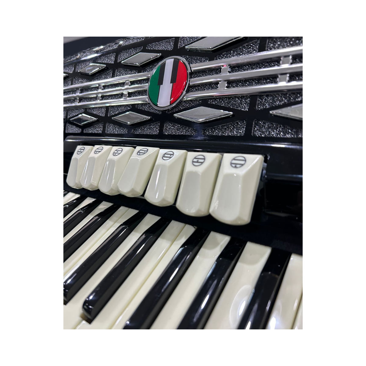 Acordeon de ótima qualidade sonora e acabamento requintado. Possui 120 baixos, 41 teclas, 3º voz, 7 registros no teclado e 2 registros no baixo.