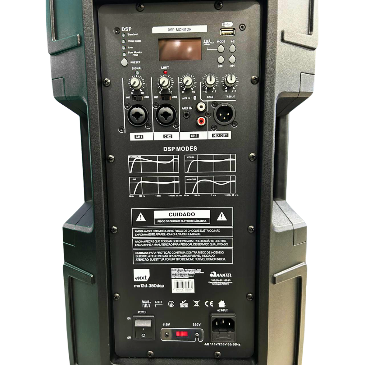 A Caixa Acústica Amplificada MX12D-350DPS é equipada com Tecnologia DPS (Processamento Digital de Sinais) para ajustes precisos de equalização. Um sistema de áudio com DPS pode controlar eletronicamente os sinais enviados ás vias de reprodução. Com isso, é possível corrigir sinais que não trariam o áudio desejado, suprimir curvas indesejadas e reduzir distorções e ruído. Caixa Bi amplificada, robusta, durável e capaz de entregar um som de altíssima qualidade, com proteção integrada contra sobrecarga e aquecimento. Perfeita para quem busca precisão sonora e potência em um único equipamento.