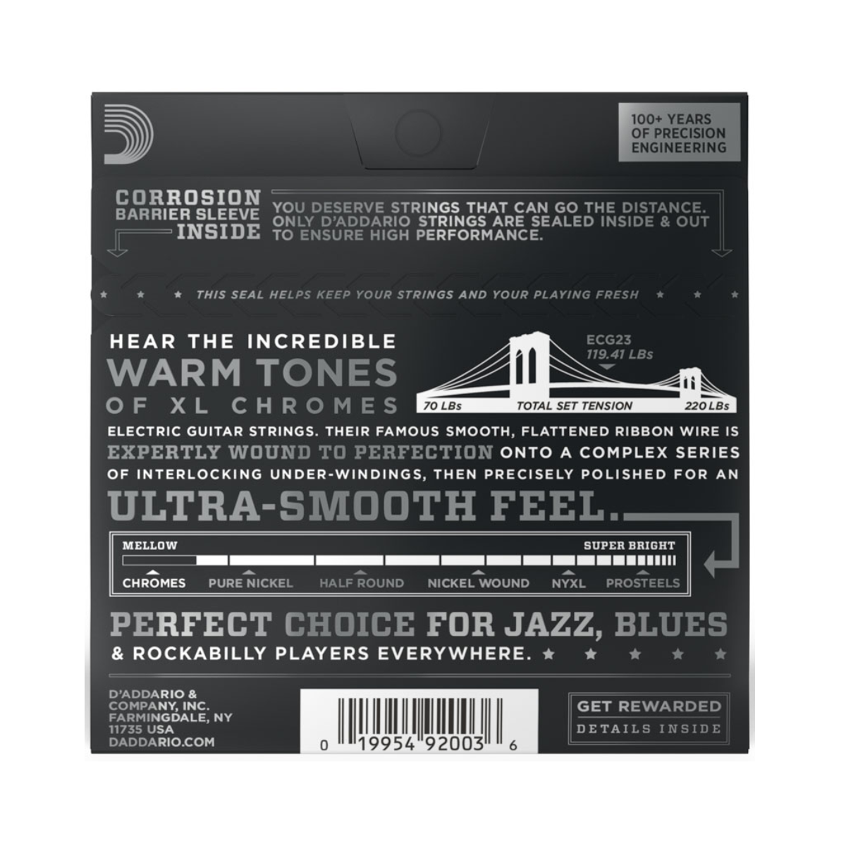 As cordas D’Addario Chromes Flat Wound são as cordas “flat” mais famosas do mundo, devido a seu toque macio, cobertura lisa e excelente sonoridade. Apos o enrolamento, cada corda recebe 3 etapas de polimento, resultando numa superfície macia que faz das cordas Chromes a escolha ideal dos guitarristas de jazz e fusion. O timbre quente é ideal para o jazz, rockabilly e R&B.
