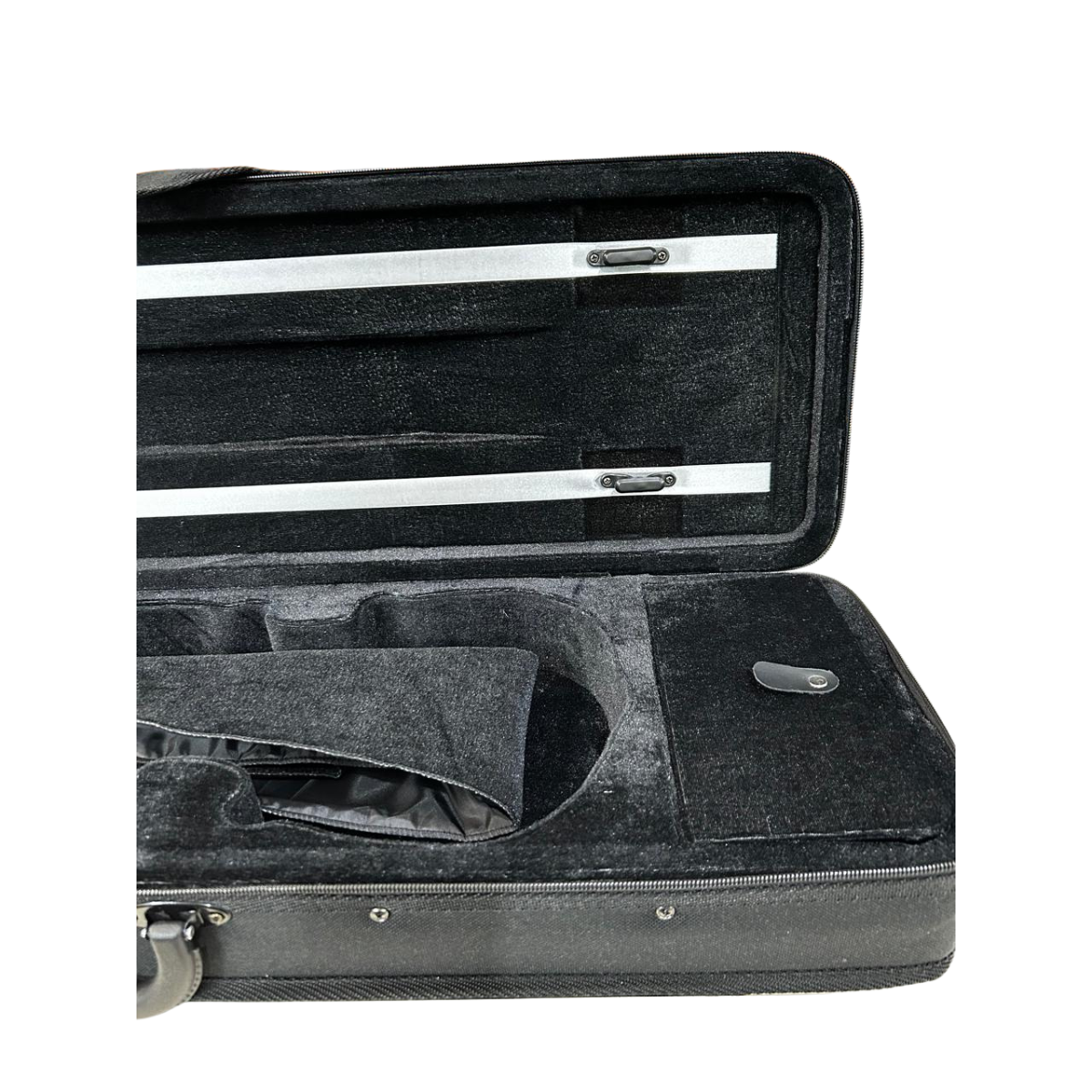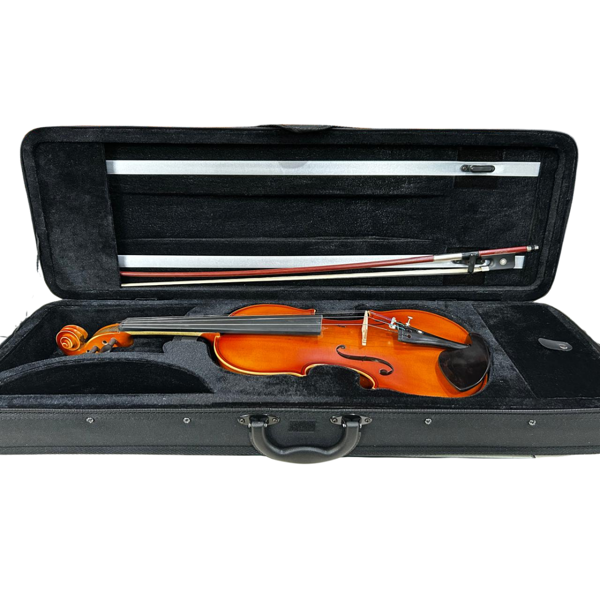 Estojo para Violino moldado em isopor injetável no formato retangular, leve e compacto. Possui espaço para 2 arcos, porta espaleira, bolso interno para pequenos acessórios, manta para cobrir o violino, bolso externa para guardar métodos e partituras.