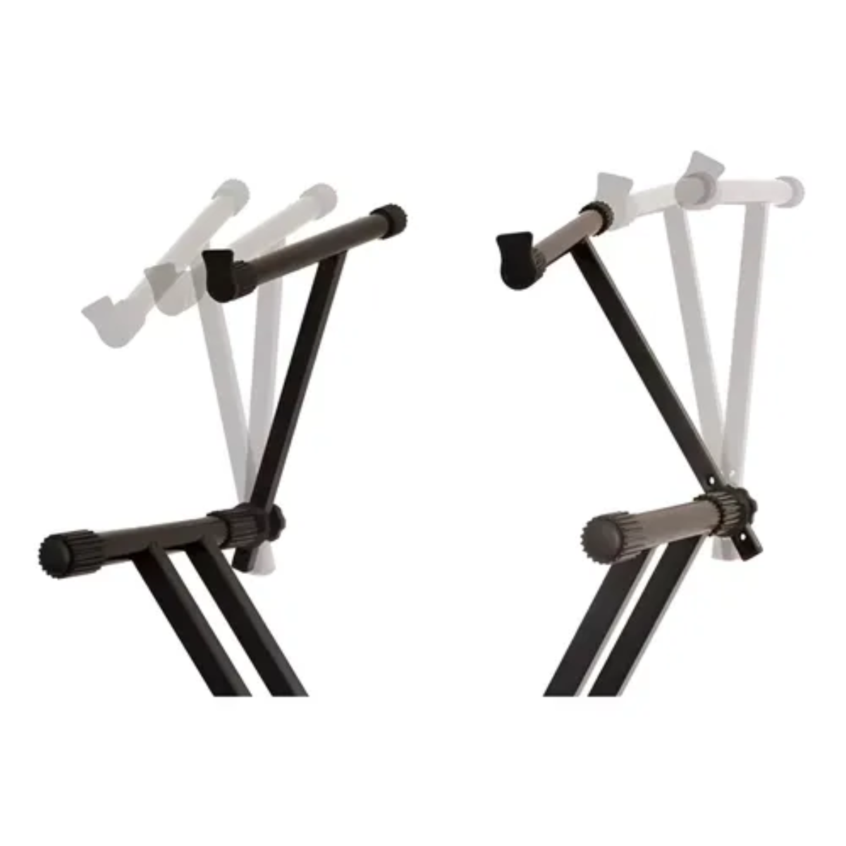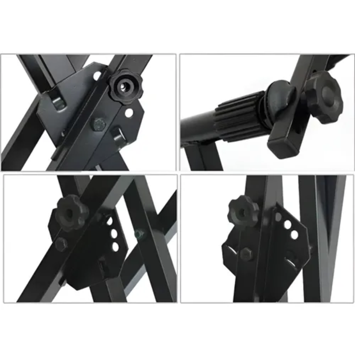 A base superior é desmontável e possui até 3 ajustes de altura com trava modelo catraca com 01 par de Hastes, caso o músico não deseje utilizar mais de um teclado, poderá utilizar apenas o suporte sem as hastes.