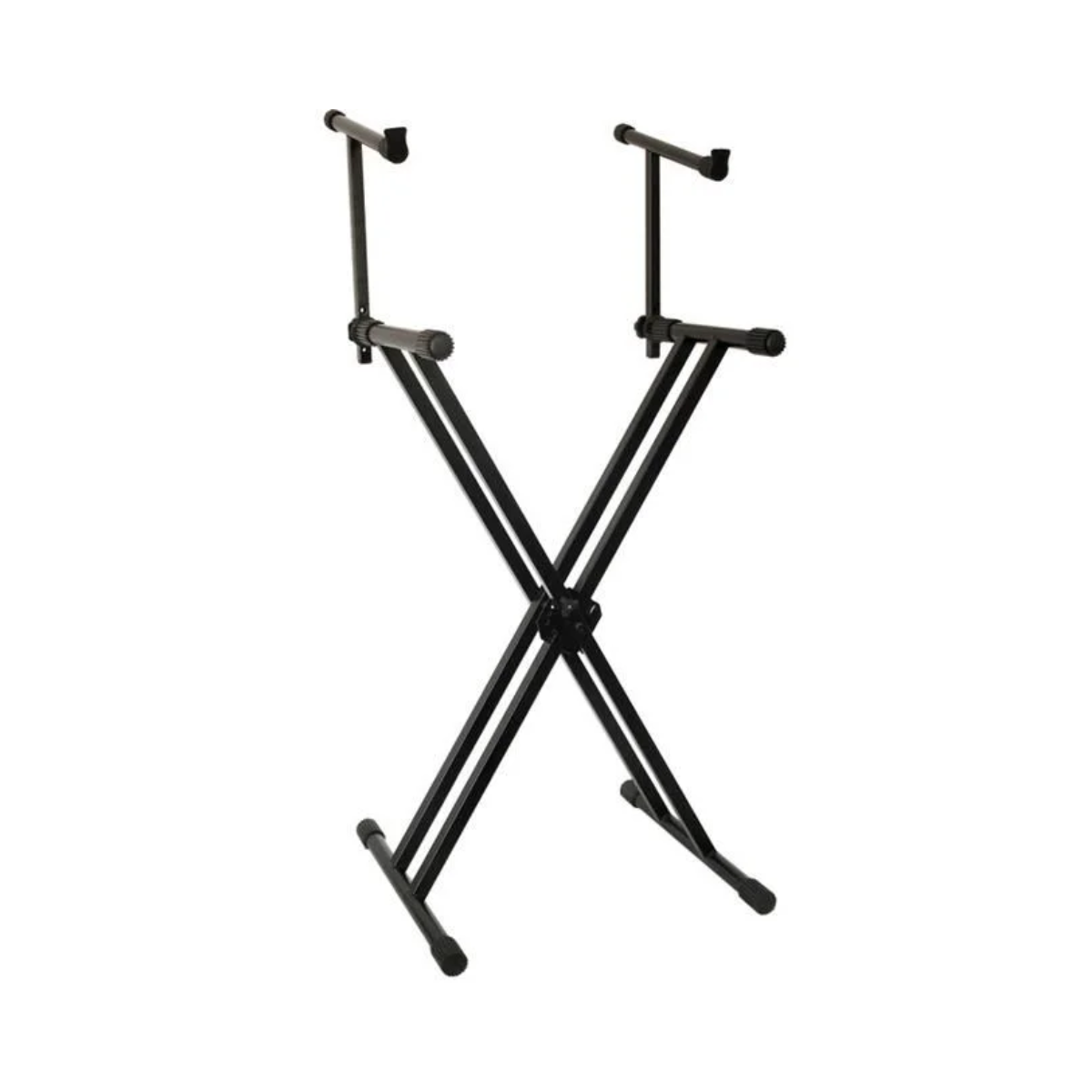 Este suporte duplo é ideal para até 02 teclados ou 01 piano digital + 01 teclado. Este modelo de suporte é bem reforçado com a base formato duplo “X”, fabricado com metal 25mm x 25mm. Possui regulagem de altura ao qual proporciona o músico tocar sentado ou em pé, para melhor segurança, possui trava modelo “Pino”, a trava é fabricada em metal bem reforçado de excelente qualidade e durabilidade. O suporte é fabricado totalmente em metal com pintura epóxi na cor preto (anti-ferrugem). O apoio para os teclados (local onde apoia o teclado) possui partes em plástico emborrachado, evitando que o instrumento deslize sobre o suporte, mantendo melhor estabilidade.